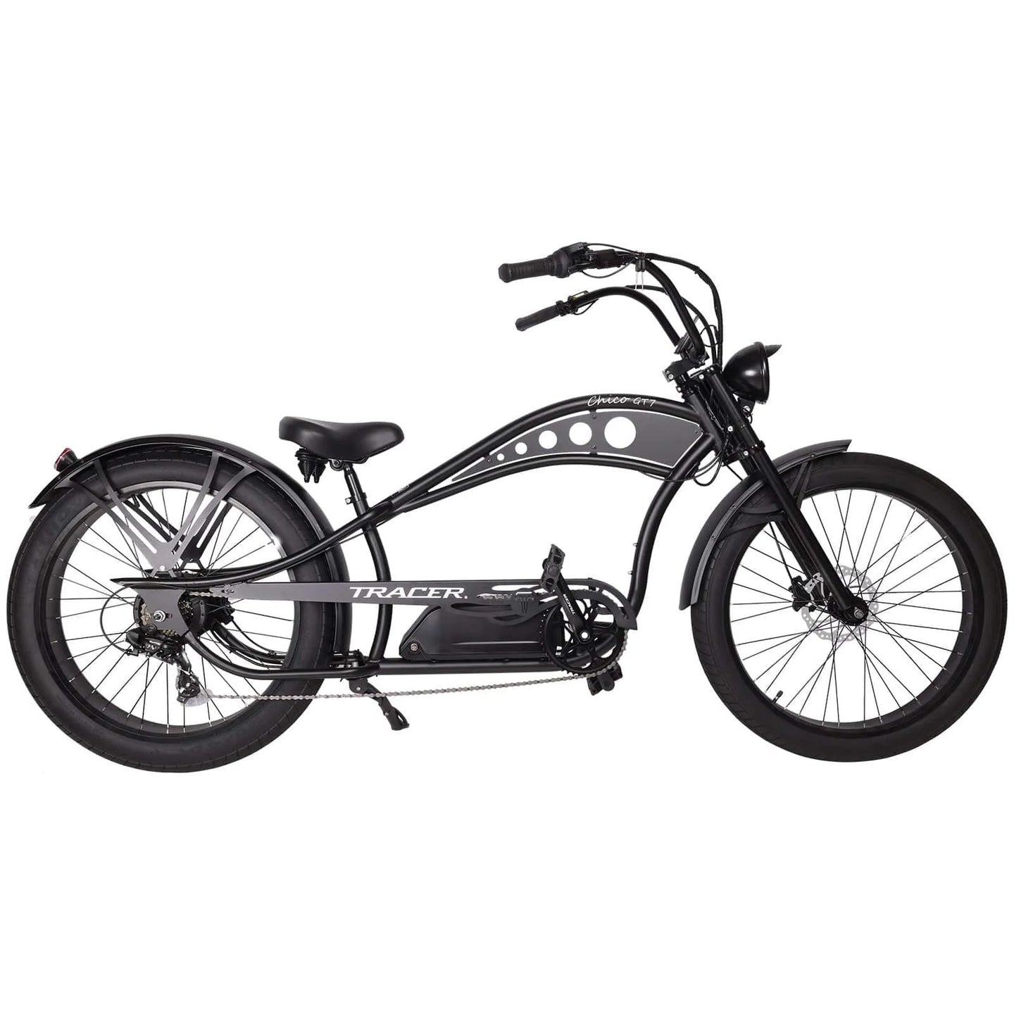 Introducing TRACER's Chico GT7 26" Chopper Stretch E-Bike, equipped with a powerful 750 Watt motor, hydraulic disc brakes, and a 12 magnet cadence sensor. The bike's sleek design features a triple tree fork, hi-rise handlebar, and alloy fat rims with white wall tires for a smooth ride. Take charge with TRACER!