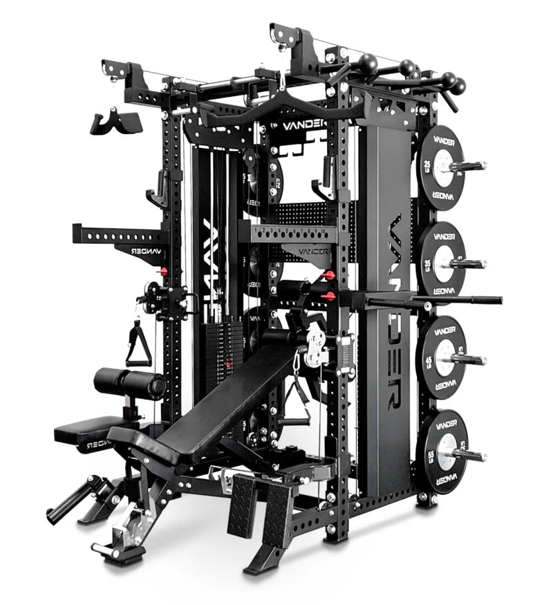 Series 2 Is Here! The Fully Loaded, VANDER Competition M14 is the ULTIMATE most versatile, heavy duty functional trainer in its class. A functional trainer is a workout machine with pulleys. This feature is the #1 most versatile and used feature on a workout machine. In the space of the Functional Trainer World in this industry, the VANDER M14 is hands down at the top of its class. Competition approved, 3mm thick, Indestructible Steel Construction. Featuring 300 lb. weight stacks on each side with both 1:1 and 2:1 Pulley ratios, this set up offers a convenience to keep heavier and lighter weight ready, without having to keep changing the pin to a desired weight or adjusting the pulleys from top to bottom. Paired with the ultimate 3 in 1 bench which offers leg extension, hamstring curl and arm preacher curl exercises. This setup features 4 pulleys, which is a huge convenience factor having pulleys ready for use in several different positions. The top pulleys are positioned specifically for workouts that require full extensions such as lat pull-downs and offer a 1:1 pulley ratio allowing heavy lifts. The lower pulleys are adjustable from top to bottom. The possibilities of the workouts on this trainer are endless.